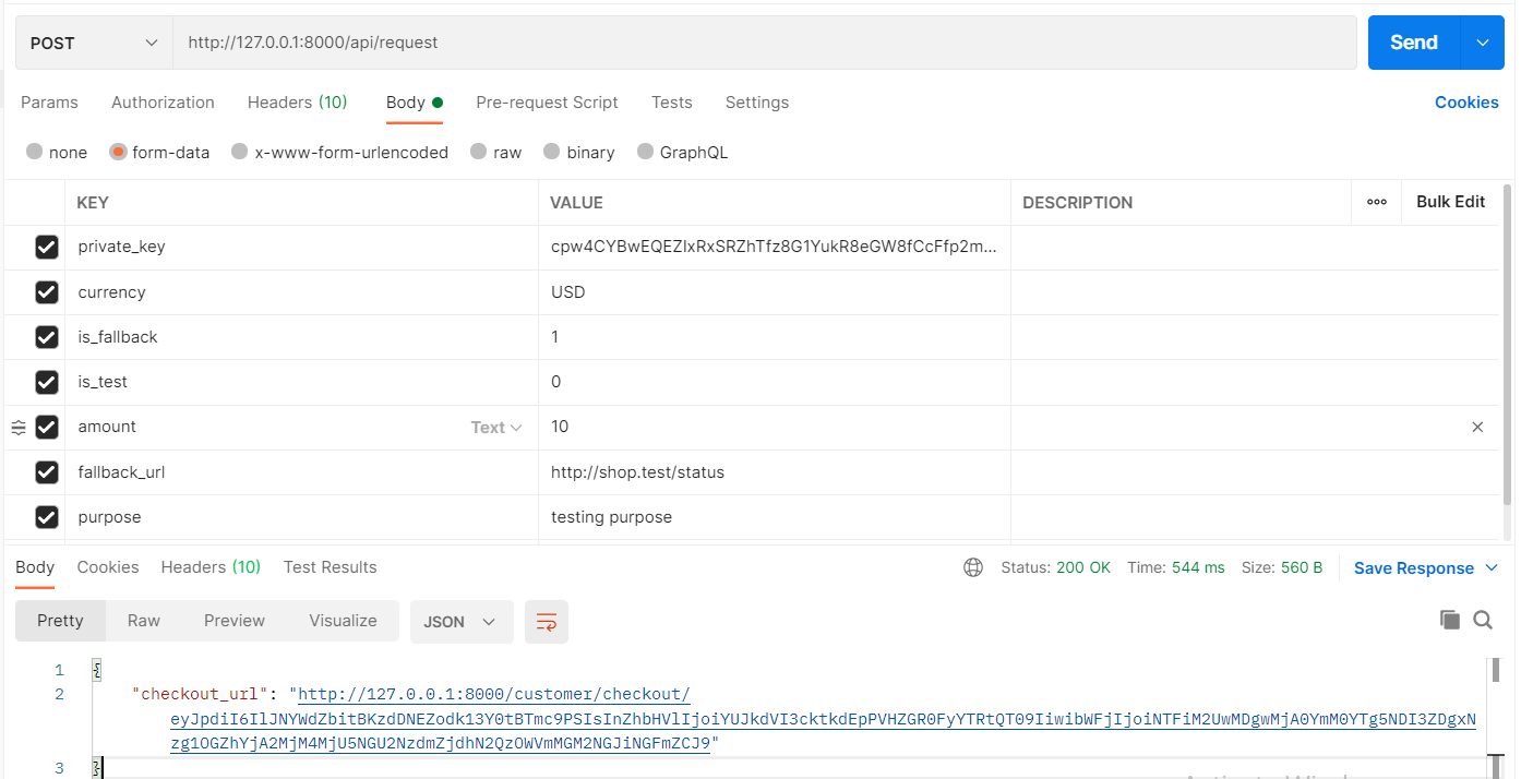 In body add private_key,currency,is_fallback,url,is_test,amount as key and their values from the credentials of merchant profile.